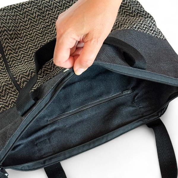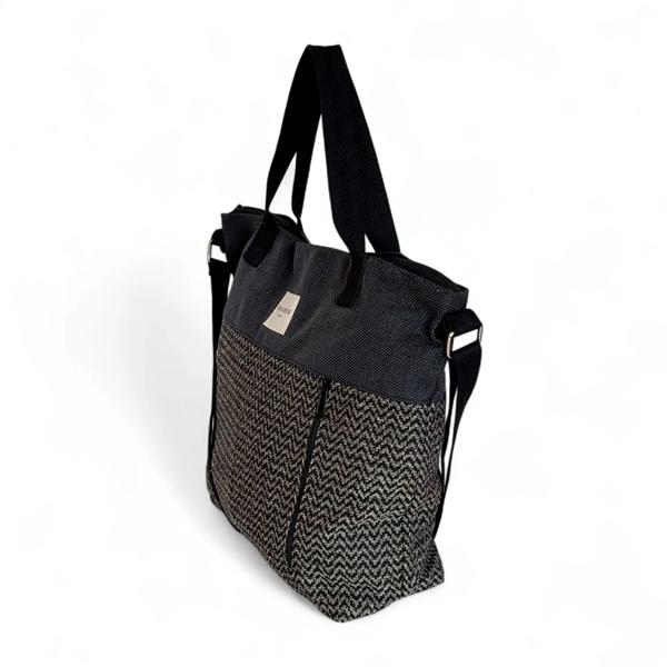 El Bolso Grande Dana de De La Mur combina diseño, funcionalidad y estilo en una pieza única ideal para el día a día. Su diseño exclusivo mezcla dos tejidos de alta calidad: la parte superior en negro liso y la inferior con jacquard de estampado zigzag en beige y negro, aportando un toque moderno y sofisticado.