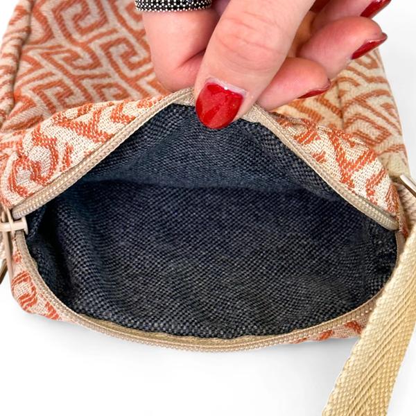 Bolso porta móvil para llevar tipo bandolera, con cremallera en la parte superior y asa larga ajustable de cinta de espiga de algodón de color beige. Bolsillo sin cremallera en la parte exterior. Con tejido grueso de jacquard con estampado geométrico en tono teja. Forrado de tejido grueso de color gris en la parte interior.