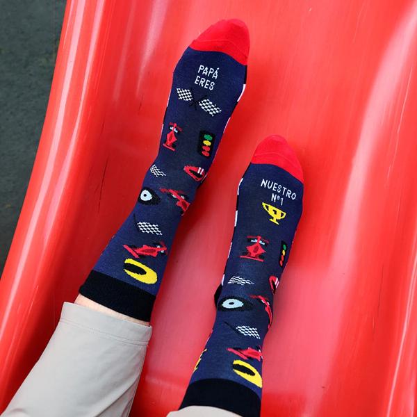 Con un diseño moderno inspirado en el mundo del motor y la competición, estos calcetines combinan estilo y mensaje emotivo. El texto «Papá eres nuestro Nº1» junto con los detalles deportivos hacen de este complemento un regalo ideal para sorprender en cualquier ocasión especial.