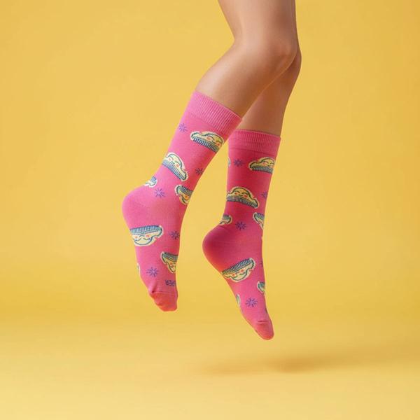 Calcetines falleros para «Súper FMI» en tono rosa, con divertidas y sonrientes peinetas en todo el calcetín.