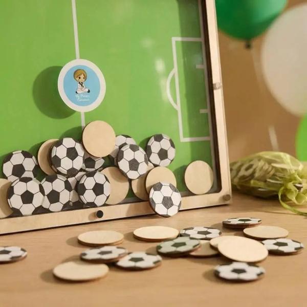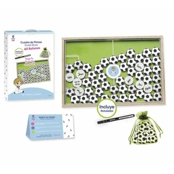 Diseñado para pequeños apasionados del balón, este original marco representa un campo de fútbol donde familiares y amigos podrán dejar su firma o dedicatoria en fichas con forma de balón. Cada mensaje se introduce en el marco, creando un recuerdo participativo, emotivo y totalmente personalizado.