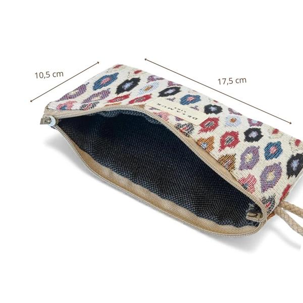 Fabricado en tejido jacquard de alta calidad (80% algodón y 20% poliéster), presenta un elegante estampado geométrico en tonos rosados y lilas. Cada neceser es único, ya que el dibujo puede variar ligeramente según el corte del tejido.