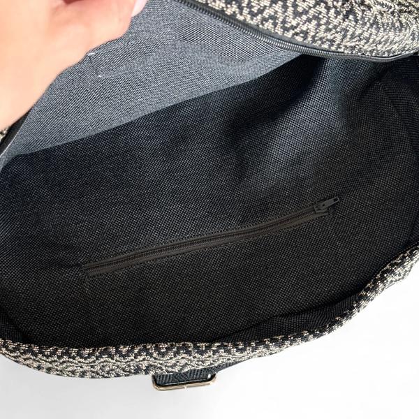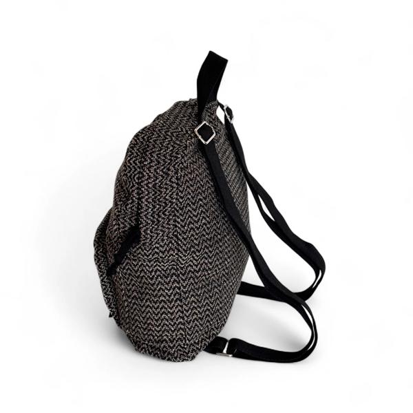La Mochila Bolsillo Dana de De La Mur es la clásica mochila que nunca falla, diseñada para ofrecerte comodidad y estilo en tu día a día. Confeccionada con tejido grueso de jacquard y estampado zigzag en beige y negro, combina diseño y funcionalidad.