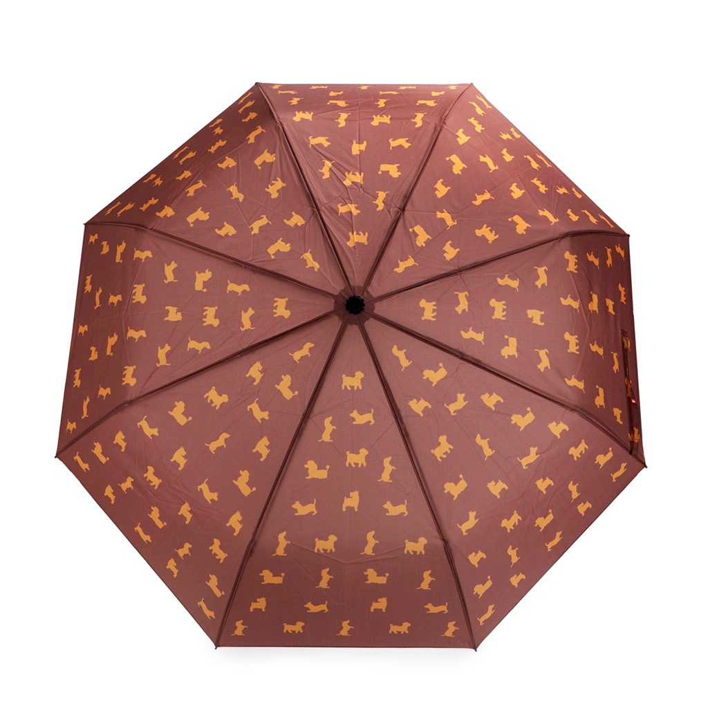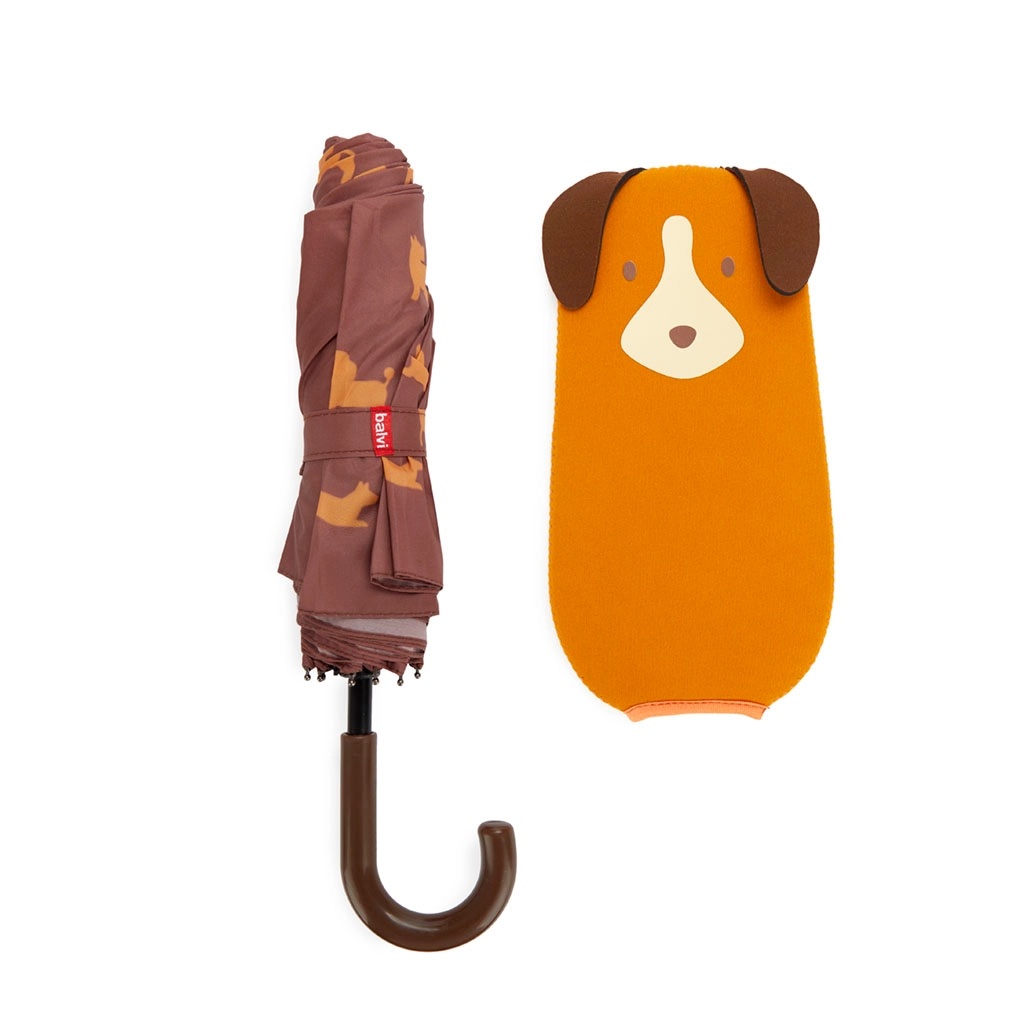 Su diseño incluye una funda de neopreno con la forma de un simpático perro para guardarlo cómodamente sin mojar tu bolso o mochila. El paraguas tiene un divertido patrón de siluetas de perros y su mango simula la cola del animal cuando está cerrado.