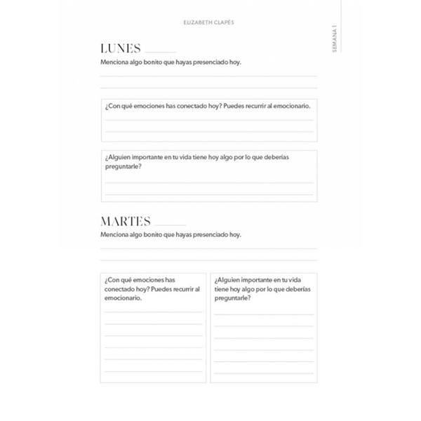 Además, encontrarás espacios para anotar tus pensamientos y hacer las listas que te recomendamos tener a mano siempre. Con ellas, podrás practicar el agradecimiento y usarlas como recurso cada vez que lo necesites.