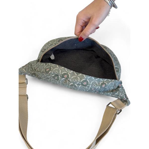 Bolso riñonera tipo bandolera con asa larga ajustable de cinta de espiga de algodón de color beige. Con un tejido fino de half-panama con estampado geométrico en tonos verdes. Cierre superior con cremallera. Forrado de tejido grueso de color gris en la parte interior.
