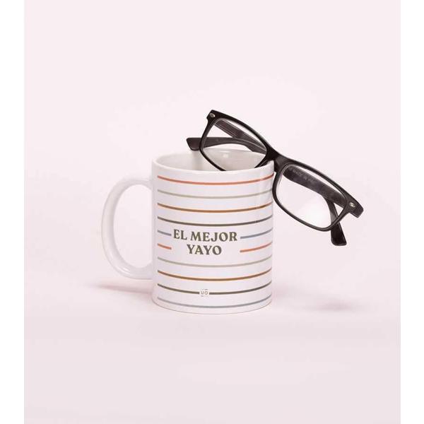 Esta taza blanca de alta calidad está decorada con rayitas de colores y la frase El mejor yayo, convirtiéndose en un detalle práctico, bonito y lleno de significado.
