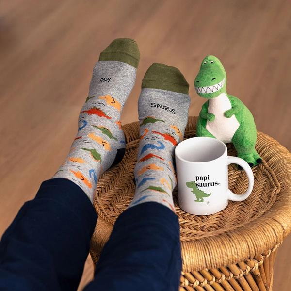 Con un diseño lleno de simpáticos dinosaurios y la palabra «Papisaurus», esta taza incluye una definición que lo dice todo: